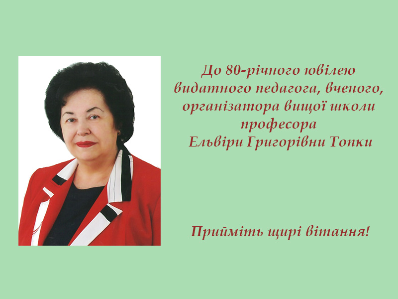 3 квітня 2021 року виповнюється 80 років з дня народження відомого в Україні та за її межами вченого, доктора медичних наук, професора кафедри клінічної анатомії, анатомії і оперативної хірургії, заслуженого працівника народної освіти України, академіка Української академії наук національного прогресу Топки Ельвіри Григорівни.