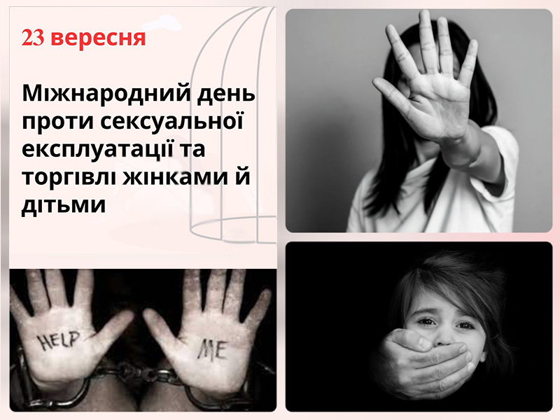 23 вересня відзначається Міжнародний день протидії сексуальній експлуатації та торгівлі жінками та дітьми, започаткований Організацією Об'єднаних Націй, покликаний привернути увагу до проблеми торгівлі людьми, яка є одним із найтяжчих злочинів сучасності.