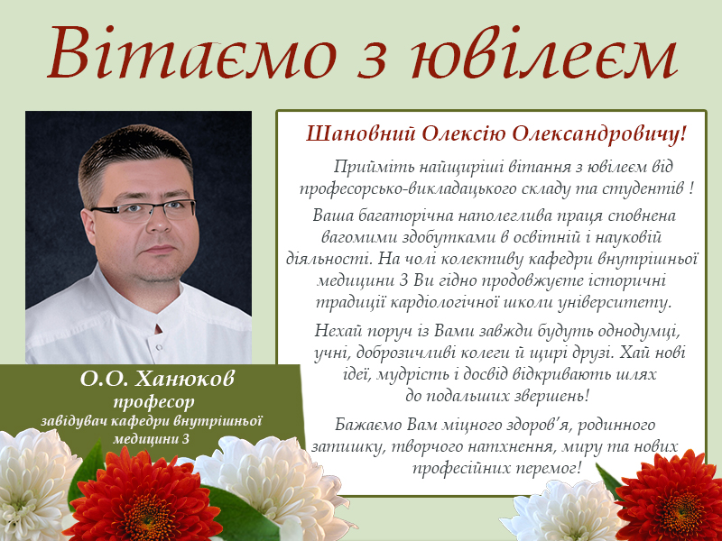 13 жовтня 2025 року святкує ювілей завідувач кафедри внутрішньої медицини 3 професор Олексій Олександрович Ханюков.
